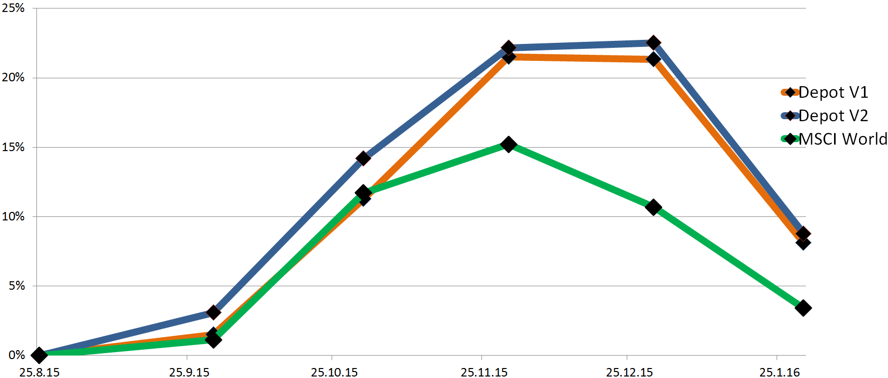Der Chart zeigt auch, dass ich in diesen 5 Monaten eine Outperformance gegenüber dem MSCI World Index (grün dargestellt) erzielt habe, der die Kursbewegungen von 1.600 Unternehmen aus 23 Industrieländern abbildet – gewichtet nach der Marktkapitalisierung. Der Index stieg um 3.4%.
