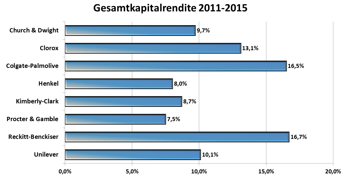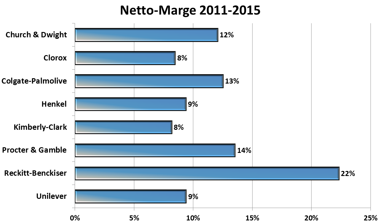 Reckitt-Benckiser spielt hier in einer eigenen Liga. In der zweiten Reihe tummeln sich Procter & Gamble, Colgate-Palmolive und Church & Dwight.