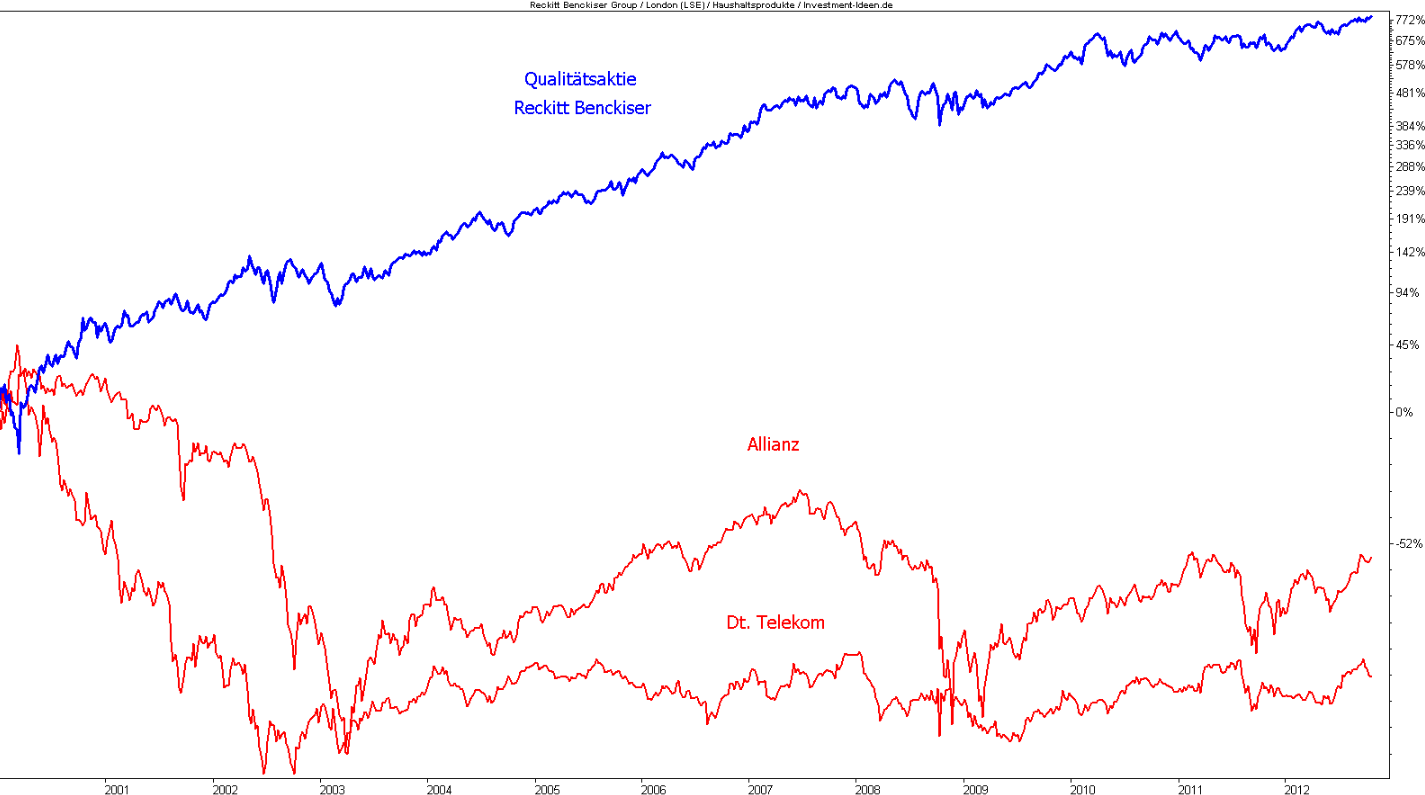 Heiko Aschoff stellt in seinem Blog gern die „Qualitätsaktien“ den „Verlierer-Aktien“ gegenüber, in Charts wie diesem.