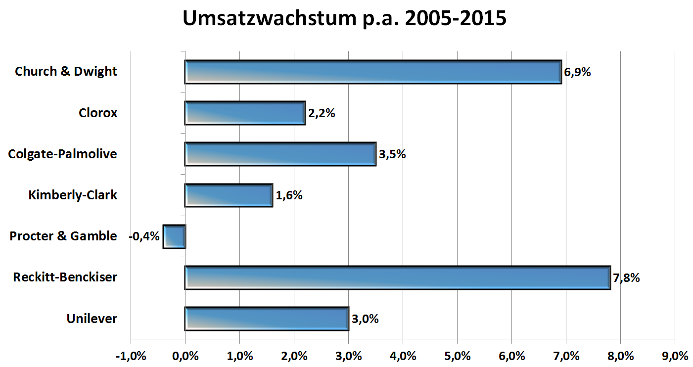 Nachfolgend seht ihr, dass Reckitt-Benckiser und Church & Dwight mit Abstand am Schnellsten gewachsen sind in den vergangenen 10 Jahren. Procter & Gamble hingegen tritt auf der Stelle. Ein Umsatzrückgang in einem Zeitraum von immerhin 10 Jahren ist ein Armutszeugnis, wenn ich mir das Wachstum der Peergroup ansehe.