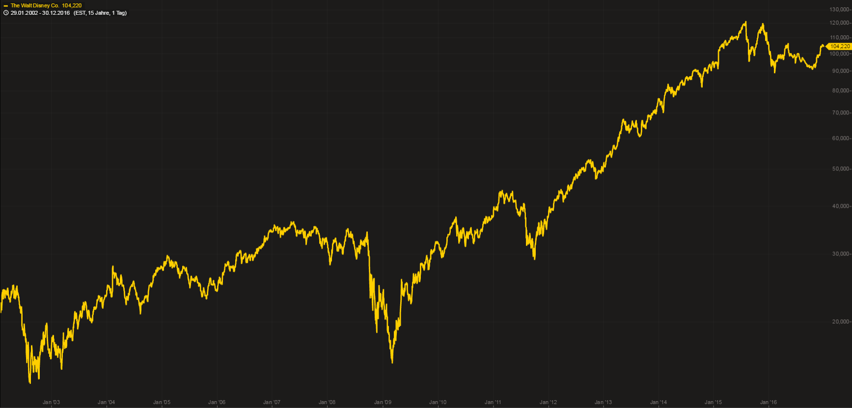 In den 10 Jahren von Ende 2006 bis Ende 2016 stieg der Kurs der Disney-Aktie um 14,3% pro Jahr. Nimmt man die mittlere Dividendenrendite von 1,3% hinzu, so kommt man auf einen Shareholder Value von 15,6% pro Jahr.