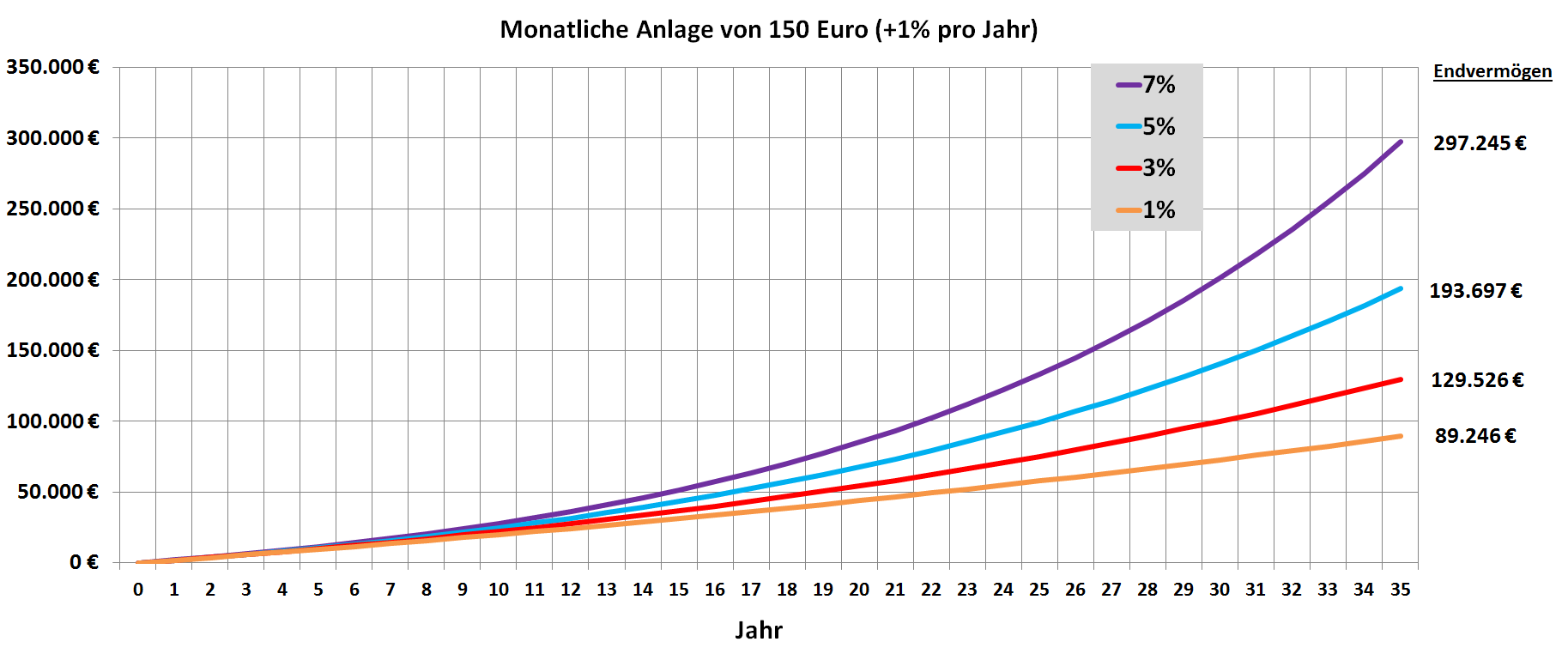 Um Angaben wie 5% oder 7% Rendite greifbarer zu machen, habe ich folgende Grafik erstellt. Sie zeigt die Vermögensentwicklung bei verschiedenen Zinssätzen und einer jährlichen Investition von 1.800€ (150€/Monat), die pro Jahr um 1% erhöht wird. 150 Euro pro Monat sollten die allermeisten von uns übrig haben.