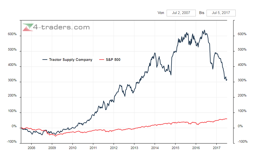 Die Outperformance der Aktie gegenüber dem S&P 500 in den vergangenen 10 Jahren zeigt die folgende Grafik. Verglichen mit Tractor Supply wirkt der breite Marktindex mickrig wie der Tagesgeldzins.