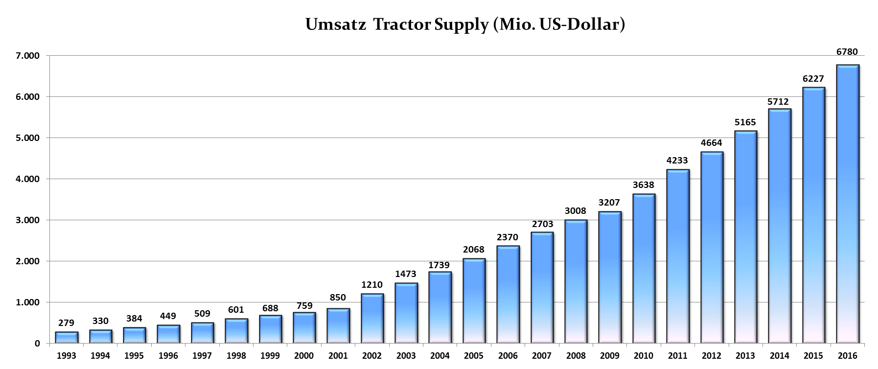 2017 war damit übrigens das 24. Jahr in Folge mit steigenden Umsätzen für Tractor Supply. Wobei die Zahl evtl. sogar noch höher liegt – ich habe keine Daten für die Zeit vor 1993 gefunden.