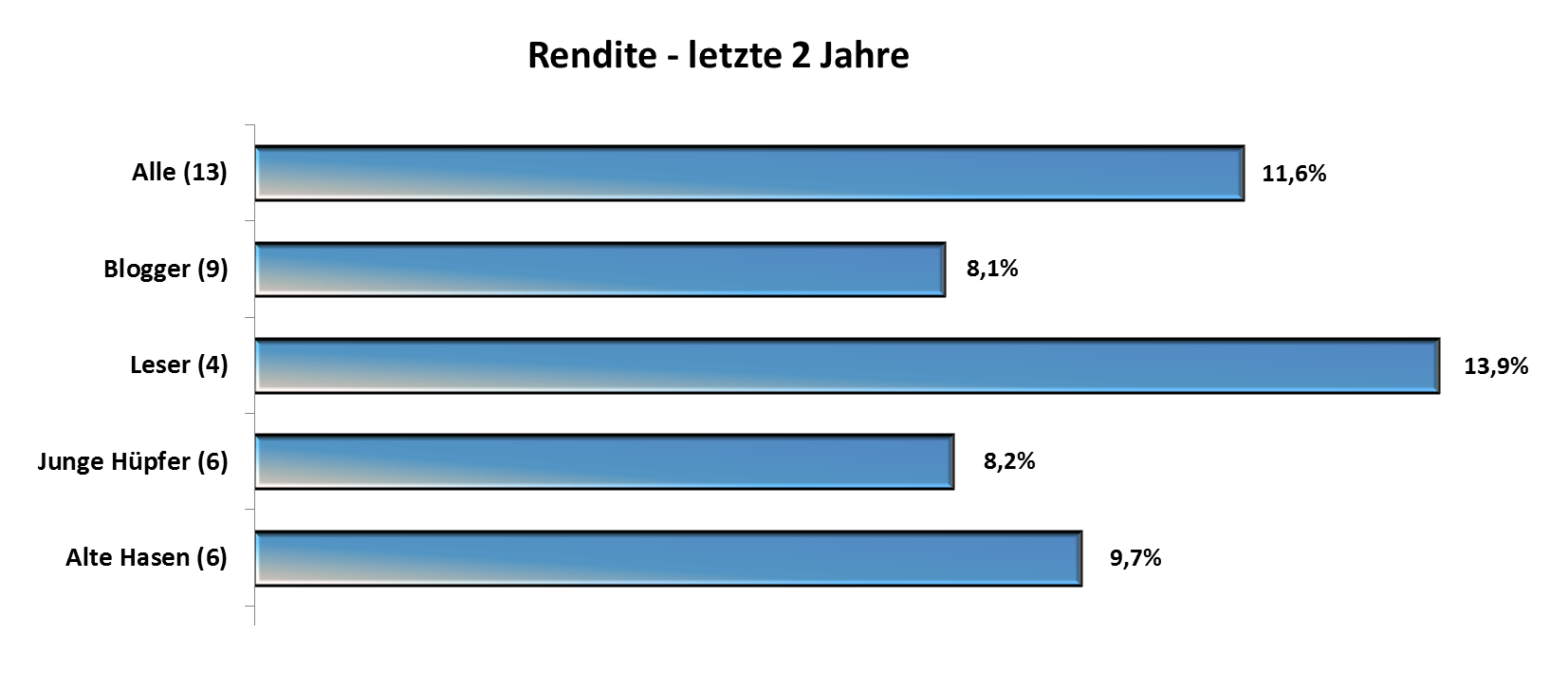 Sehr interessante Ergebnisse sind das: alle 13 Teilnehmer haben mit ihren verschiedenen Anlagestrategien im Durchschnitt der letzten beiden Jahre also durchschnittlich 11,6% p.a. erreicht. Der DAX hat im gleichen Zeitraum 8,9% p.a. zugelegt, der MSCI-Index war etwas besser mit 9,7%