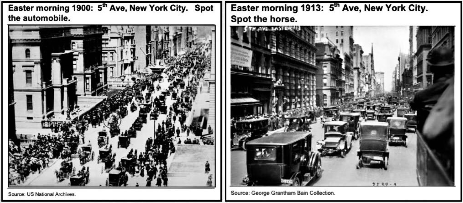 Im Jahr 1900 war die 5th Avenue in New York City zu Ostern vollgestopft mit Pferdekutschen. Nur ein einziges Auto war zu sehen.