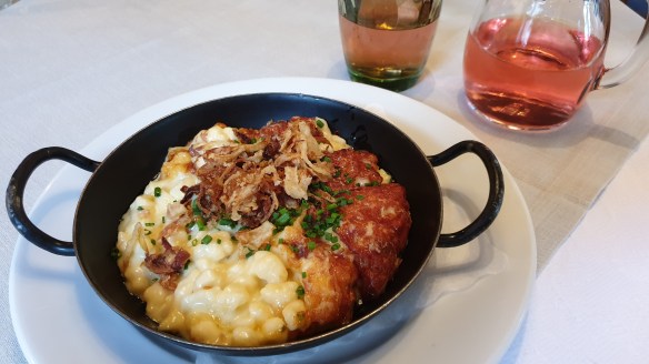• Mittwoch hatte ich Käsespätzle, dazu ein „Skiwasser“ (Himbeer-Soda), später einen Quittenbrand.