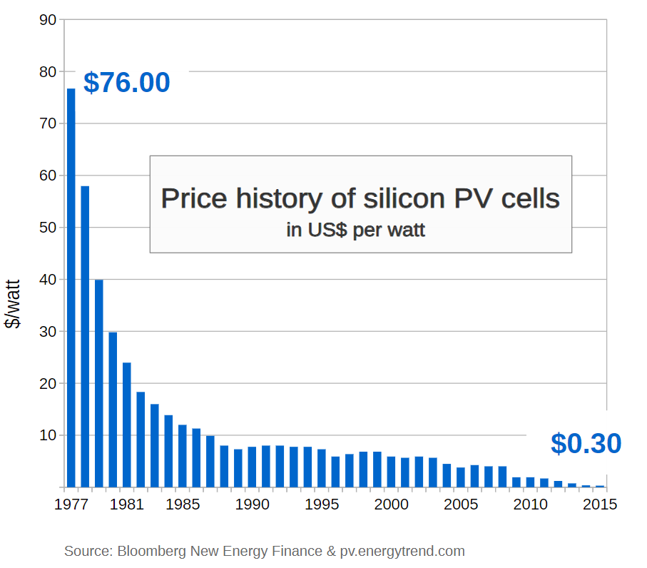 Wer glaubt, nach einem 85%-Rückgang sei hier kein Spielraum mehr, dem empfehle ich einen Blick auf die Entwicklung der Solarzellenkosten. Nach einem 85%-Rückgang ging der Preis noch um weitere 97,4% zurück, insgesamt um 99,6%.