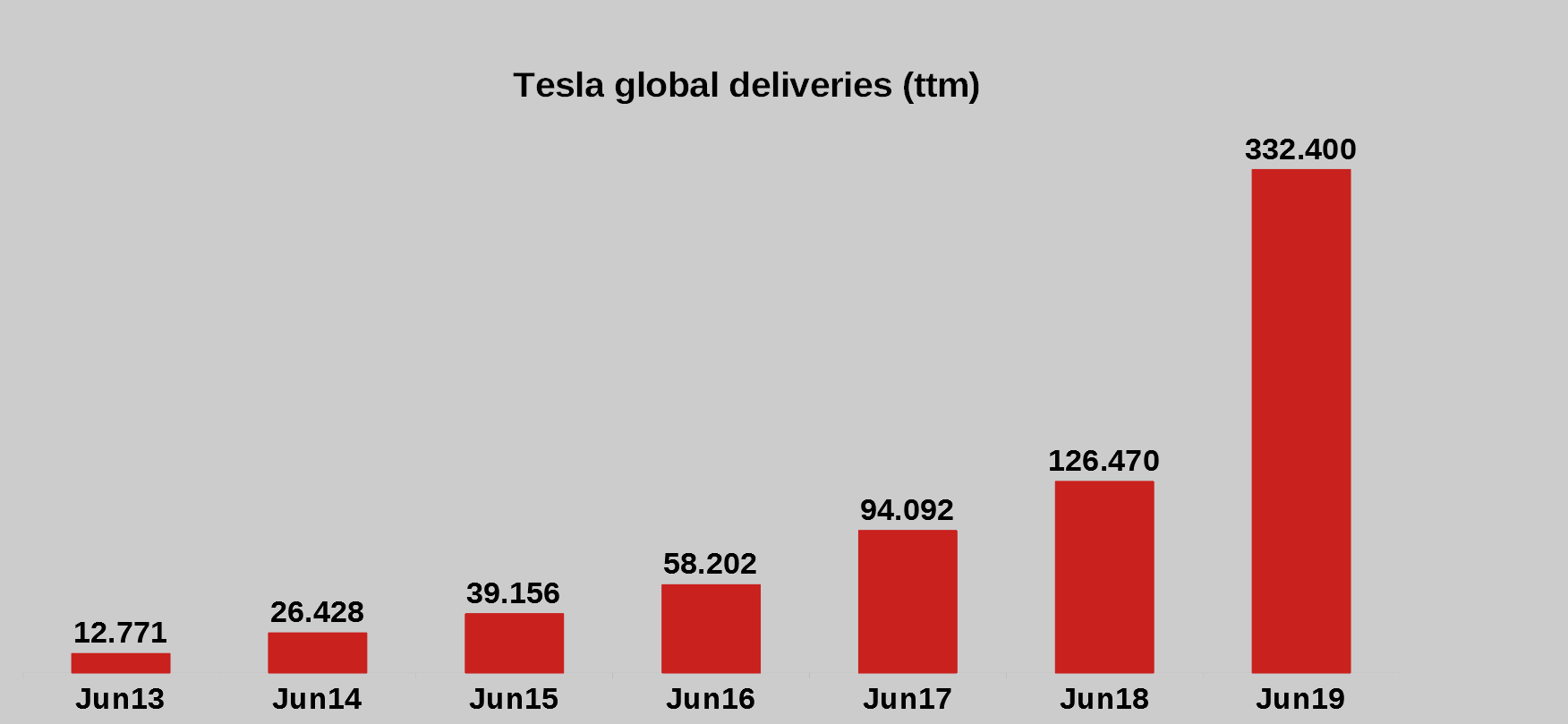 Bevor wir in die Details gehen, möchte ich in Erinnerung rufen, dass Tesla den Stückzahlenabsatz kürzlich um 163% erhöht hat. Man lieferte 332.400 Fahrzeuge von Juli 2018 bis Juni 2019 aus, nach 126.470 in den vorherigen 12 Monaten.