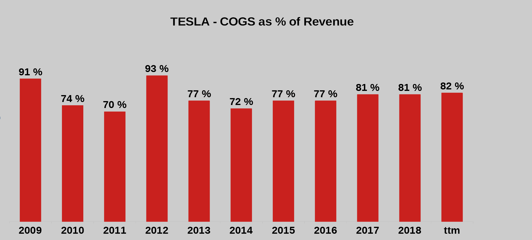 Starten wir mit den COGS (cost of goods sold), also den Herstellungskosten, hier in % vom Umsatz. Dies ist bei allen Automobilherstellern die mit Abstand größte Kostenposition.