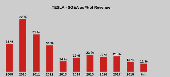 Hier hat sich Tesla durch die stark steigenden Stückzahlen erheblich verbessert und liegt mit 11% nur knapp hinter BMW und Daimler (je 10%). Tesla verzichtet zwar auf traditionelle Werbung, muss jedoch die hohen kalifornischen Personalkosten schultern. Zudem dürfte die mittlere Distanz zwischen Fabrik und Käufer (und damit die Transportkosten) bei Tesla höher liegen als bei der Konkurrenz aus Deutschland. Derzeit wird jedes Fahrzeug in Fremont hergestellt. Mal sehen, wie sich die Zahlen entwickeln, wenn in einigen Monaten die Produktion in China anläuft.