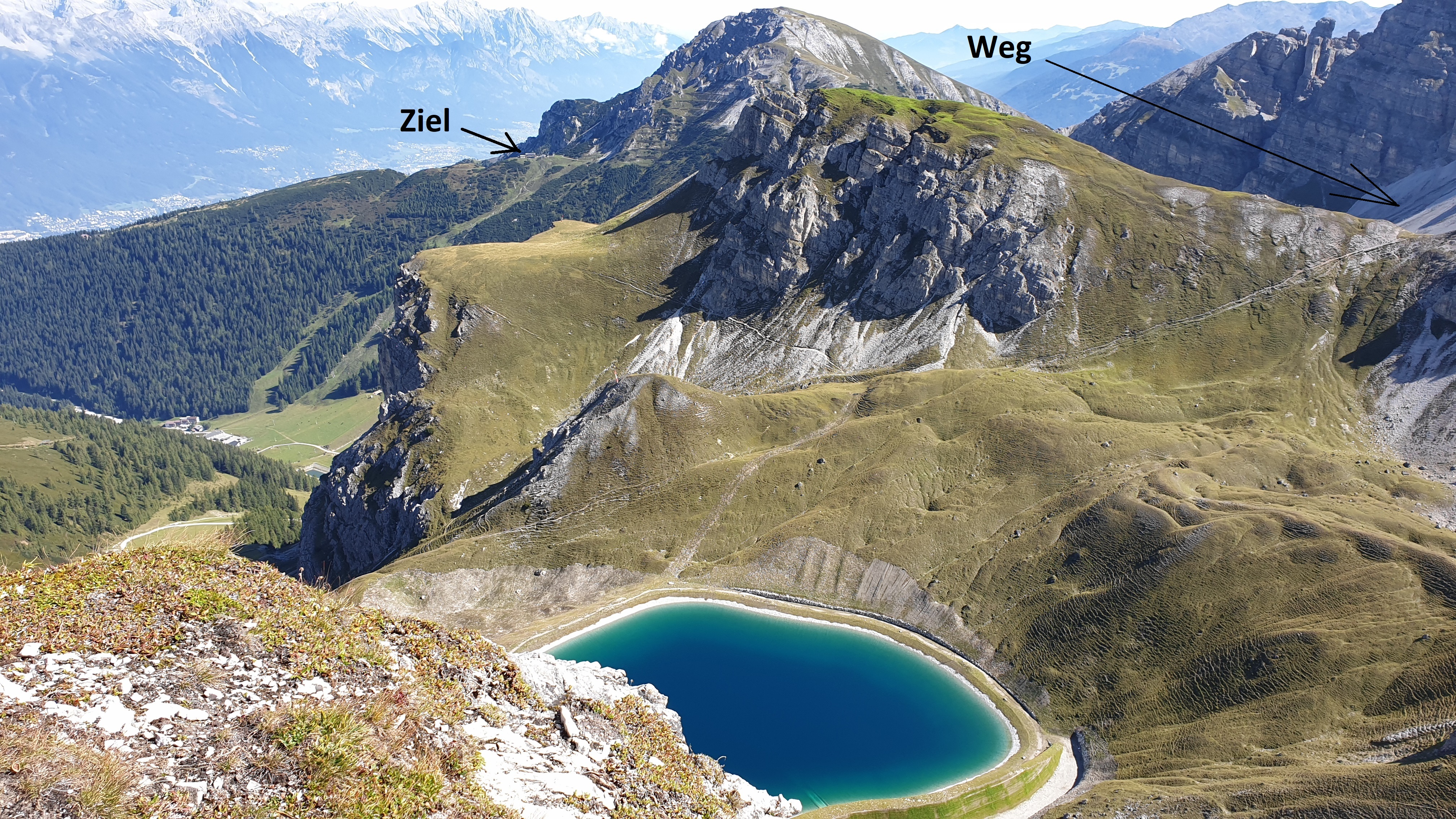 Plötzlich kam ich an einen seltenen Punkt, an dem ich sowohl den Startpunkt (Hoadl) als auch das Ziel (Birgitzköpflhaus) erblicken konnte. Es waren bereits 2 Stunden vergangen (von angeblich 2,5) und ich schätzte dass ich ungefähr 40 Prozent der Strecke hinter mir hatte.