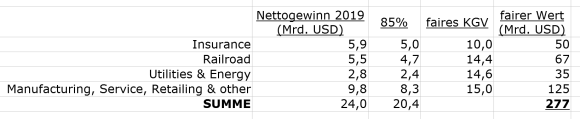 Wie bereits bei der Bewertung des Aktienportfolios sehe ich das faire KGV der nicht zu Berkshire gehörenden US-Versicherungen nicht bei 10,9 sondern 20% geringer aus Überbewertungsgründen bei 8,7. Für Berkshires Versicherungen halte ich aufgrund des erwähnten Vorteils ein KGV von 10 für angemessen.