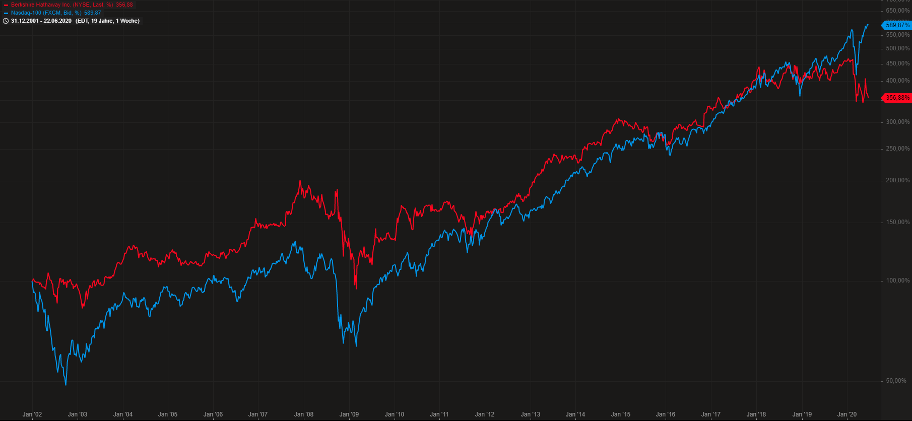 Sind mit den kapitalintensiven Geschäften von Berkshire noch hohe Renditen möglich oder fährt man besser mit den Modellen die besser skalieren wie Netflix, Facebook oder Booking? Im Folgenden seht ihr den Verlauf von Berkshire (rot) gegen den des Nasdaq-100 Index (blau) seit Ende 2001.