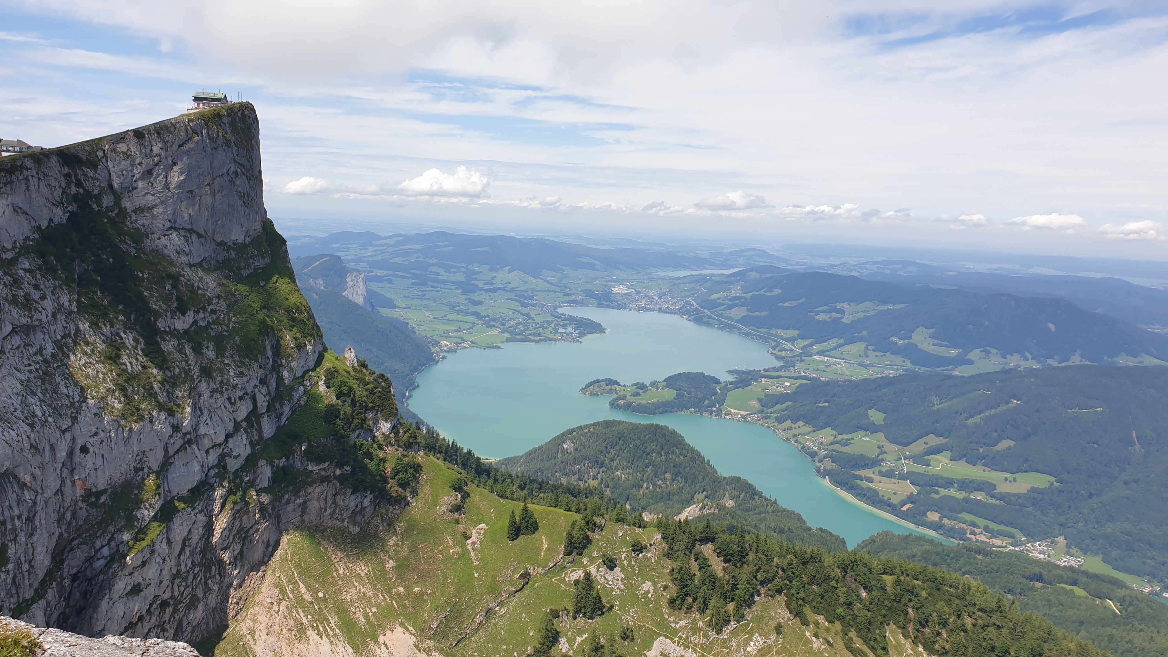 Und hier mein Blick nach rechts auf die Gipfelstube, die Bergstation und den Mondsee.