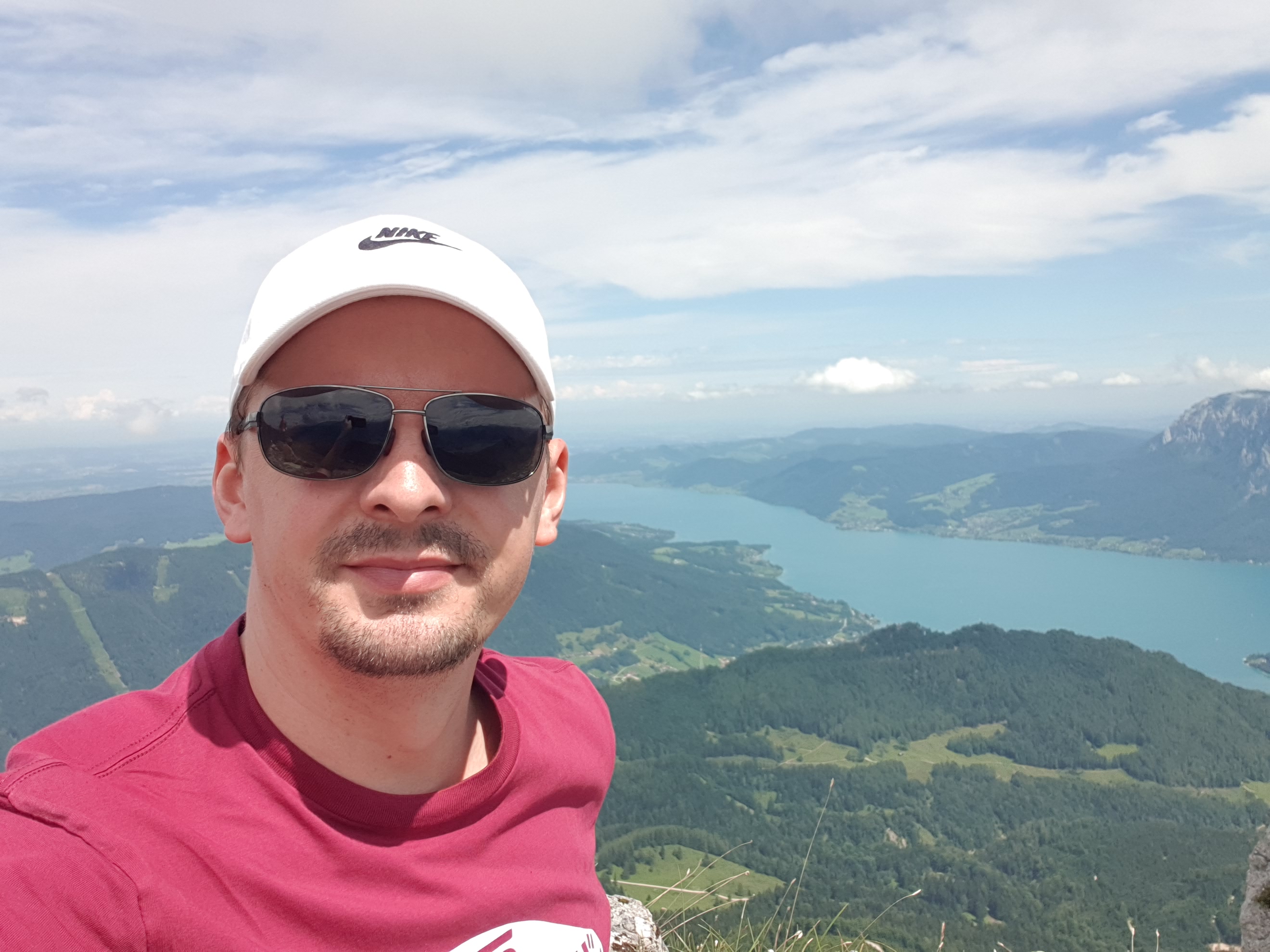 Dieses Selfie schoss ich – ganz vorsichtig – oben auf der Spitze. Im Hintergrund der Attersee.