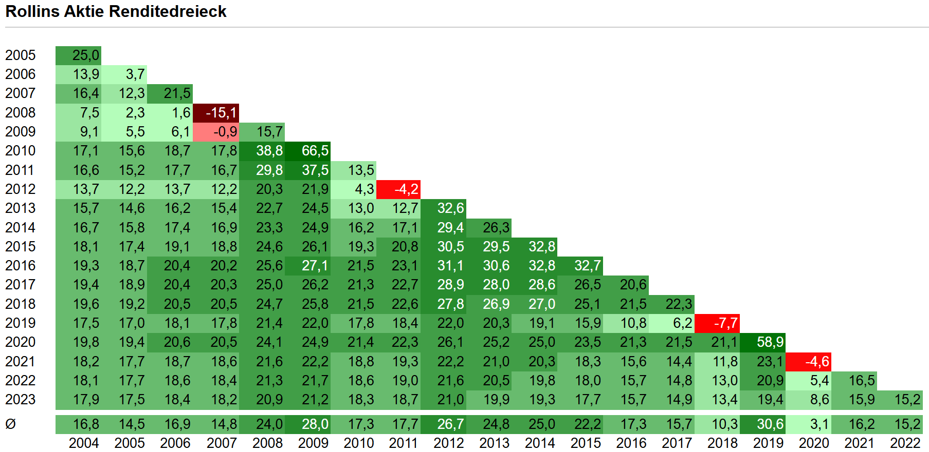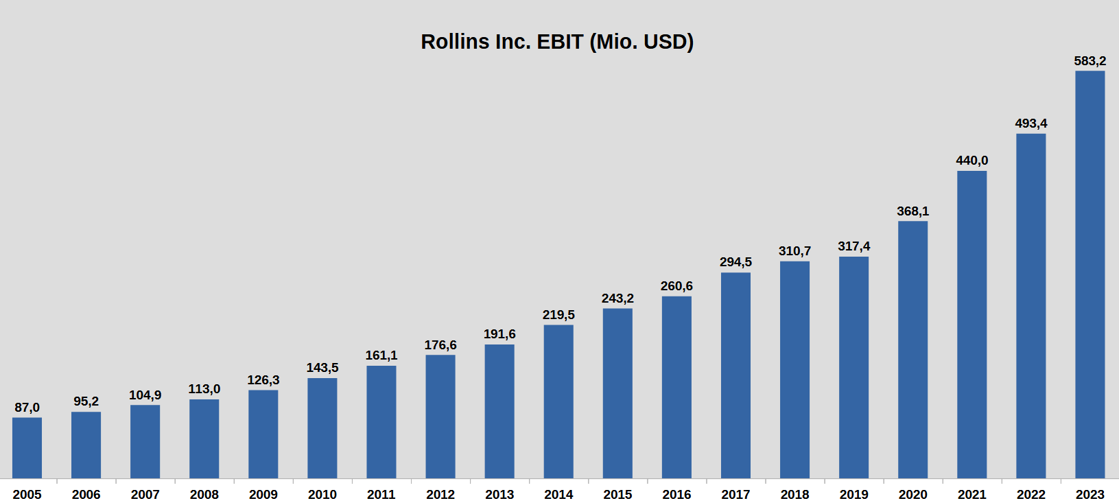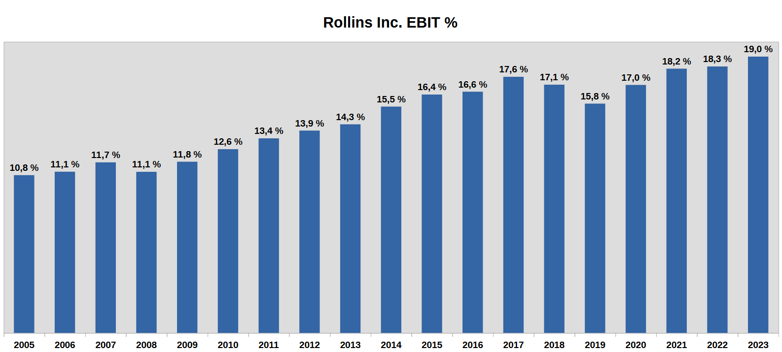 In den Jahren 2019-2023 wurden ca. 150 kleine Firmen übernommen, aber Rollins wächst organisch noch stärker: