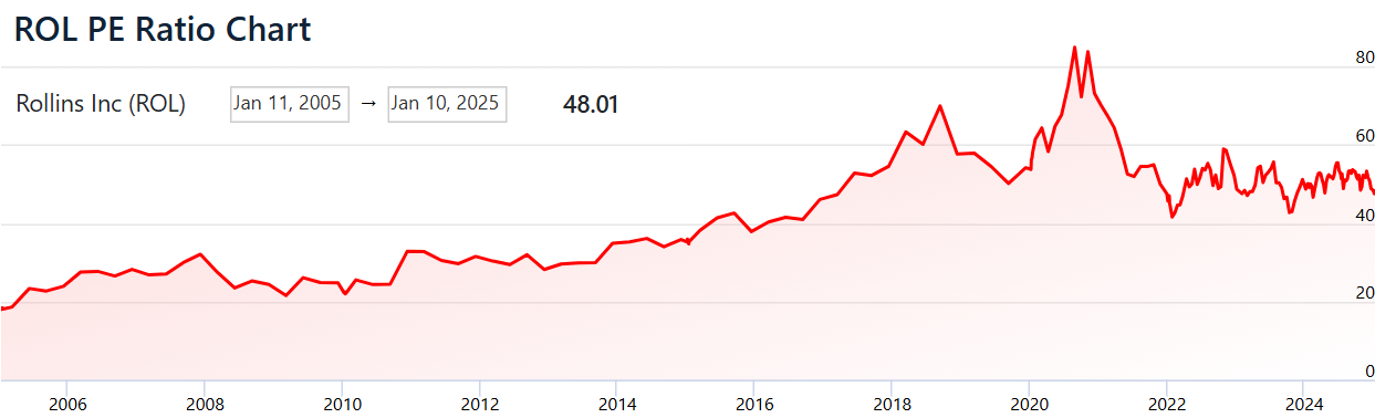 Mit einem KGV von 48 ist Rollins sehr hoch bewertet. Allerdings sieht man im folgenden Chart, dass Rollins bereits seit 2015/2016 nicht mehr mit einem KGV unter 40 zu haben war: