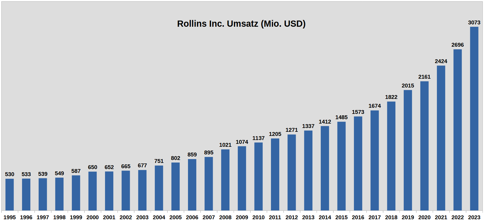 Schädlingsbekämpfung ist ein dickes Geschäft, mit dem Rollins über 3 Milliarden Dollar im Jahr umsetzt. Hier seht ihr die Umsatzentwicklung von 1995 bis 2023: