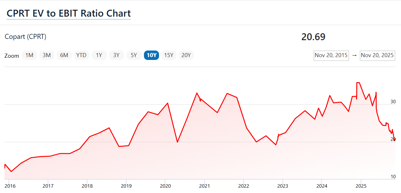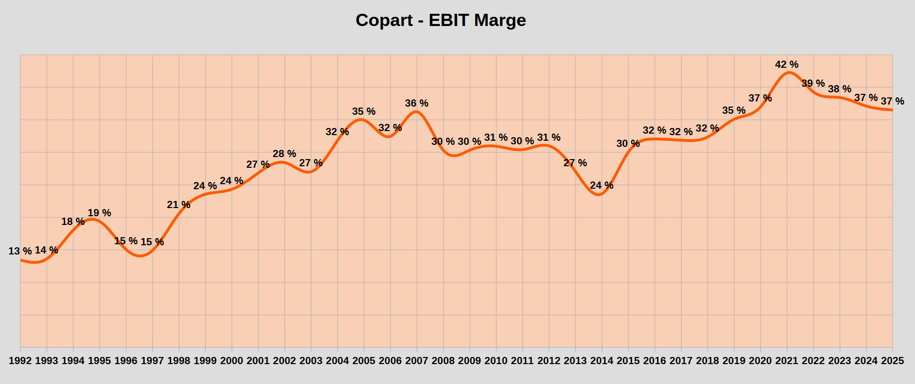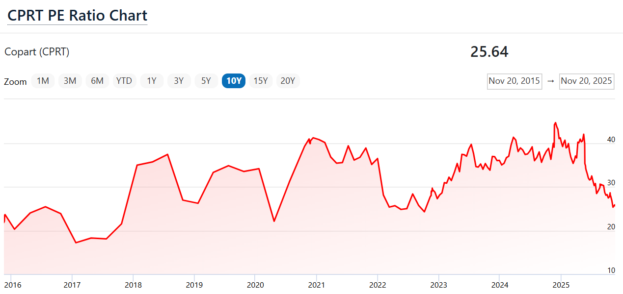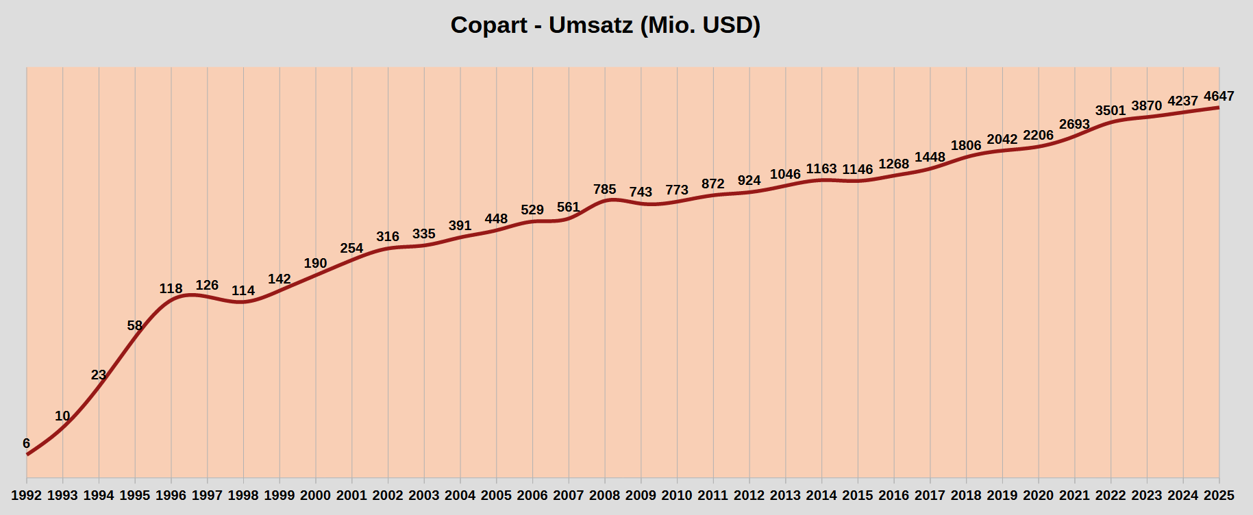 Das geringste 10-Jahres-Umsatzwachstum in den 33 Jahren von 1992 bis 2025 hatte Copart zwischen 2008 und 2018 mit immer noch beeindruckenden 8,7% pro Jahr. Nicht mal Amazon kann das behaupten (geringeres Wachstum 1998-2008 und 1999-2009).
