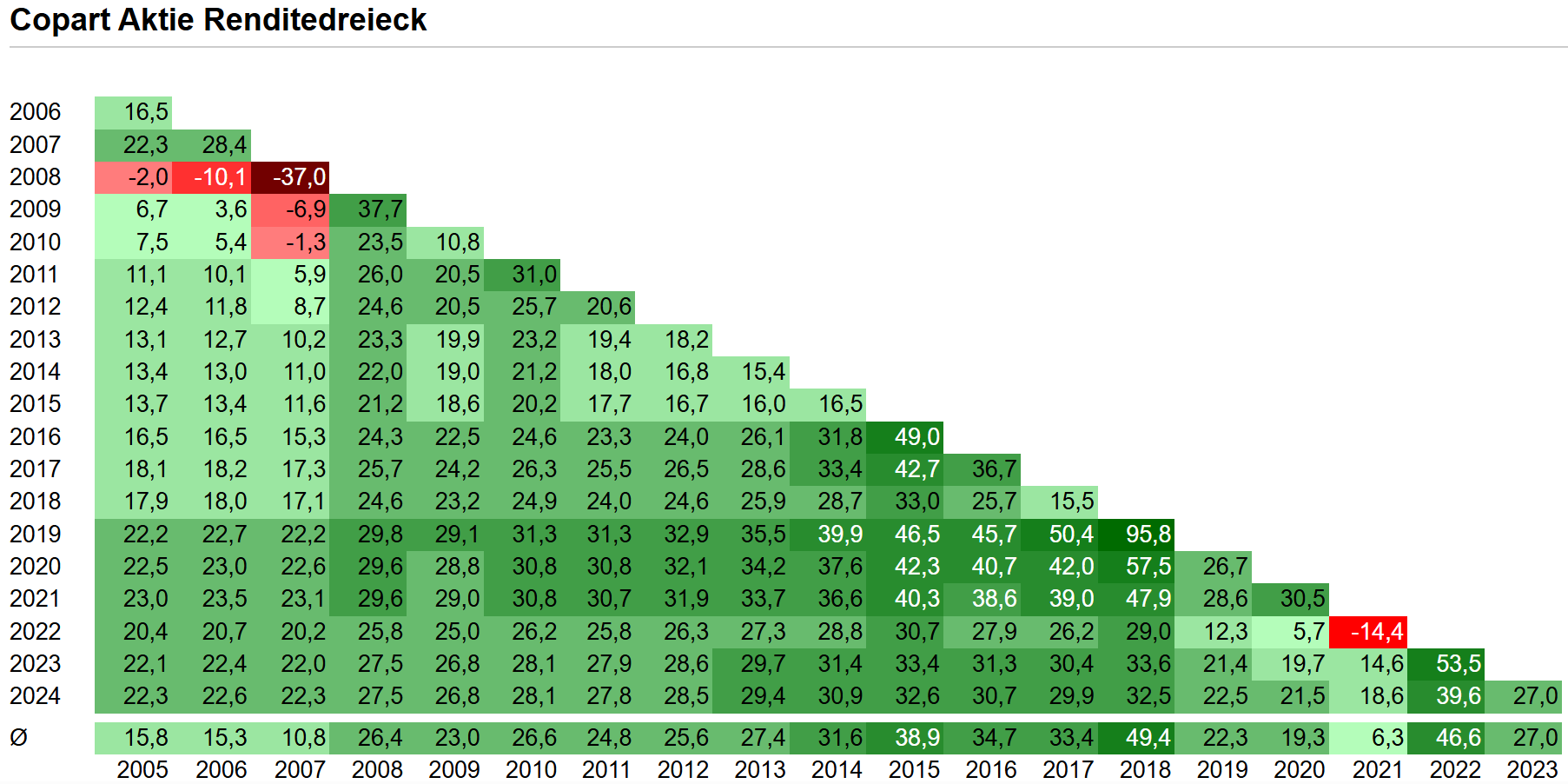- Renditedreieck 2005-2024: Kein Zeitraum von mind. 4 Jahren mit negativer Rendite.