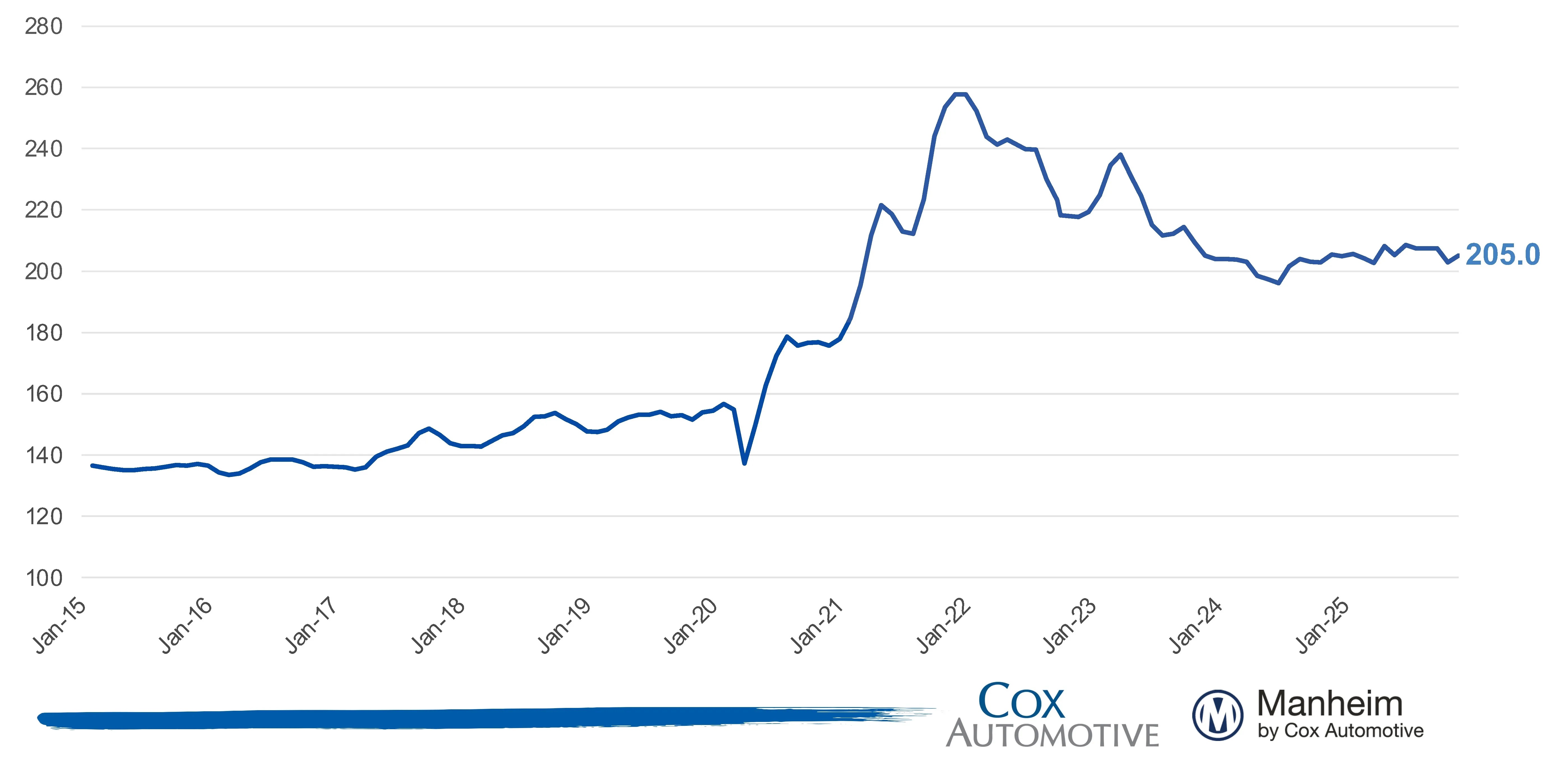 Nachfolgend seht ihr, was ich meine, im Manheim Used Vehicle Value Index von 2015 bis November 2025 (100 ist der indexierte Wert von Januar 1997).
