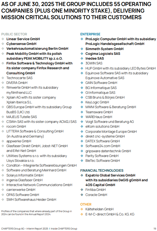 - CHAPTERS legt bei Übernahmen Wert auf: hohe Margen; wenig kapitalintensiv (Assets und Capex); geringe Churn Rate (Kunden nutzen über viele Jahre dieselbe Software)
