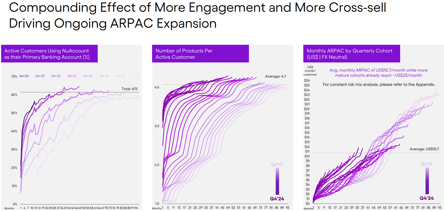 Dabei wächst der Umsatz pro Kunde, je länger der Kunde bei Nubank aktiv ist. Je mehr Vertrauen die Bank gewinnt (junge Brasilianer haben wenig Erfahrung mit Krediten), desto mehr Produkte bekommt er über die Jahre angeboten (Cross-Selling).