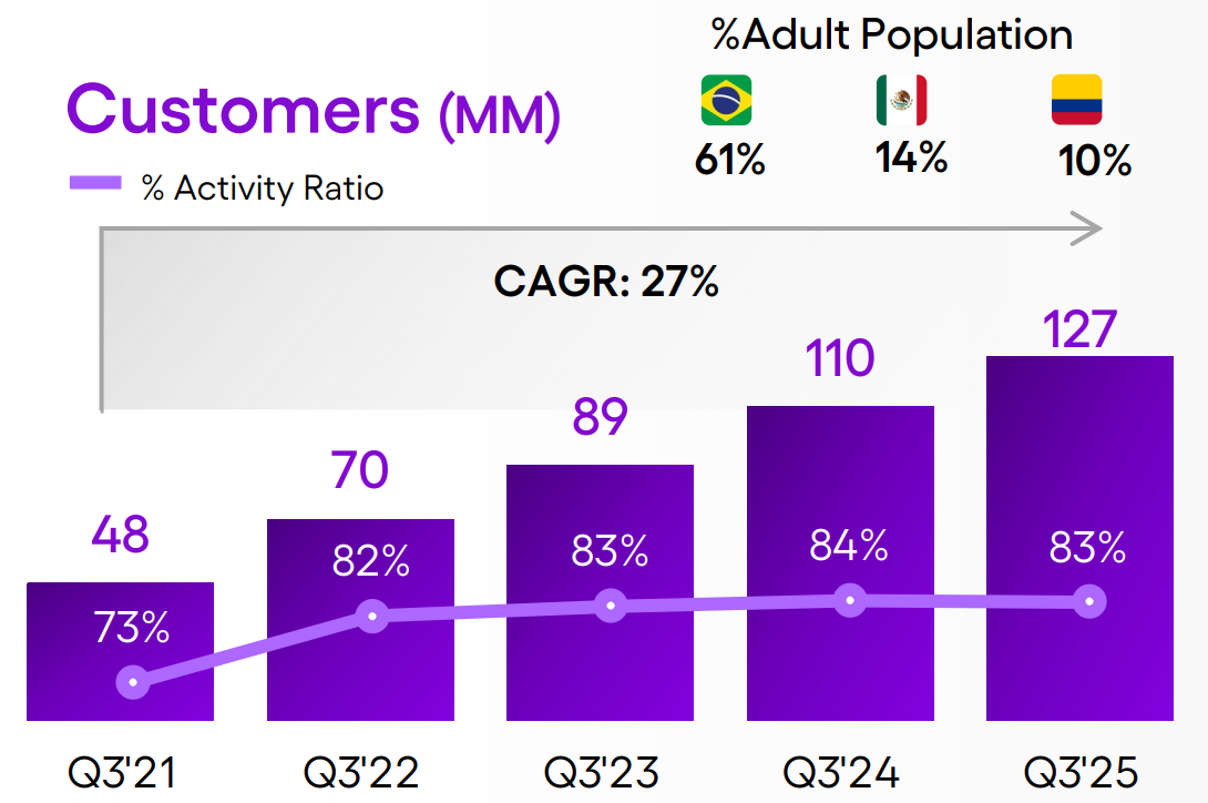 127 Millionen Kunden hat Nubank in Brasilien (110 Mio; 61% der Erwachsenen), Mexiko (13 Mio; 14%; Launch Karten 2020; Launch Konten 2023) und Kolumbien (4 Mio; 10%; Launch Karten 2020; Launch Konten 2024).
