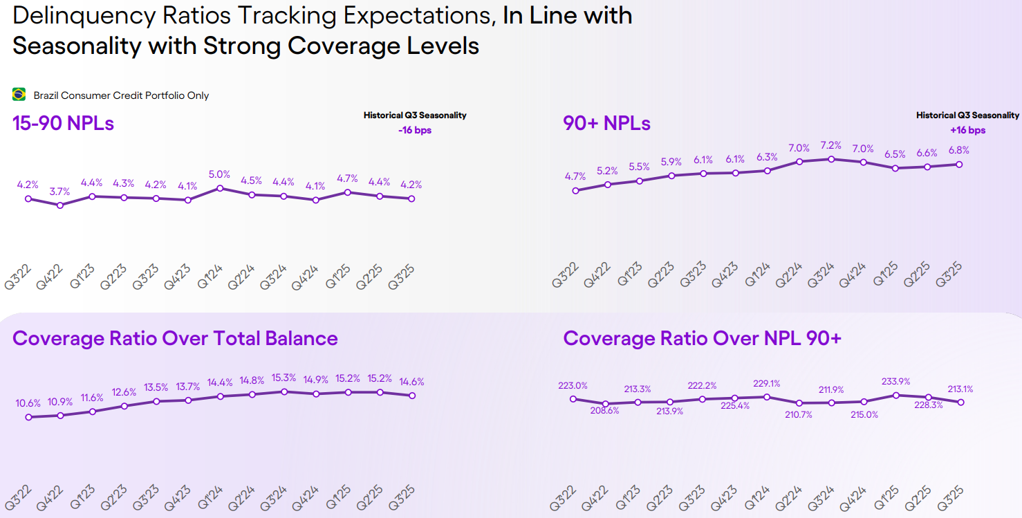 Drittens: Nubanks Non-Performing-Loans 90+ (Kredite deren Zinsen seit mehr als 90 Tagen nicht bedient werden) liegen bei 6,8% (normal sind 3-4%). Das sollte man im Auge behalten, auch wenn diese stark besichert sind.
