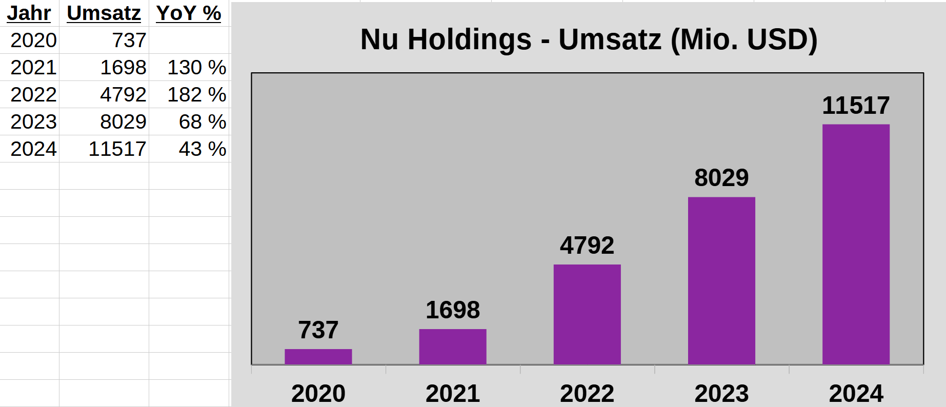 Fünftens: Mit einem KGV von 32 (bzw. 20 Forward P/E) ist Nubank für eine Bank nicht gerade günstig bewertet. Allerdings wächst das Unternehmen wie verrückt.