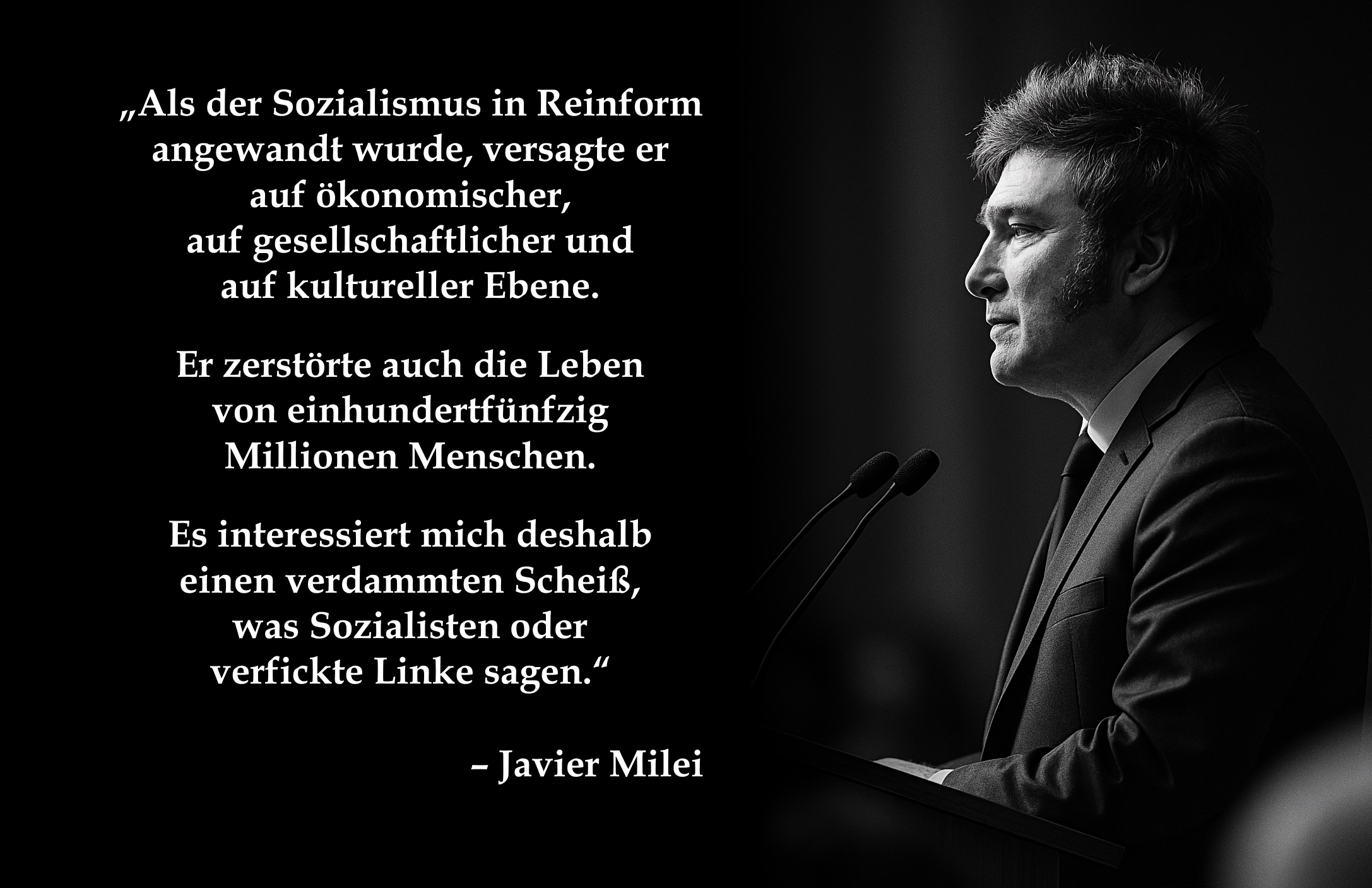 „Die libertären Reformen eines Ludwig Erhard, die Währungsreform und die Einführung der Marktwirtschaft waren eine Schocktherapie. Aber Erhard hatte dafür nicht in einem Wahlkampf Werbung gemacht, sondern die Gunst der Stunde genutzt, um das durchzusetzen, was er für richtig hielt. Zum Glück für Deutschland. Das Erstaunliche ist daher nicht so sehr, dass Milei noch radikalere Reformen als Erhard vorschlägt. Das Einzigartige ist, dass er diese Reformen im Wahlkampf angekündigt hat und dafür gewählt wurde.“